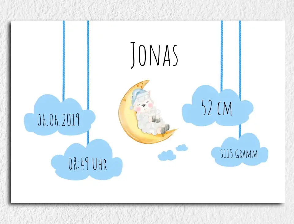Personalisierte Leinwand Schäfchen auf Wolke mit Geburtsdaten und Name neugeborene Jungen