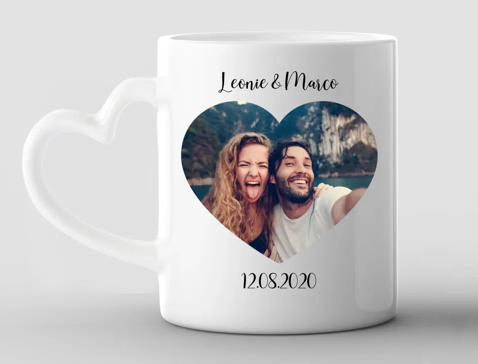Personalisierte Tasse Herzhenkel eigenes Foto in Herzform mit Name und Datum